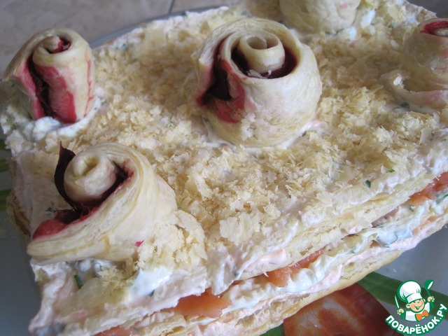Первой в ситуации разобралась моя тётя и скомандовала :"Нож мне,быстро!"Закусочный торт из слоеного теста с икорным кремом и кусочками малосольной семги