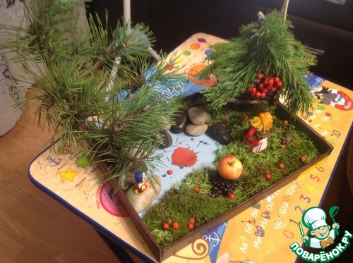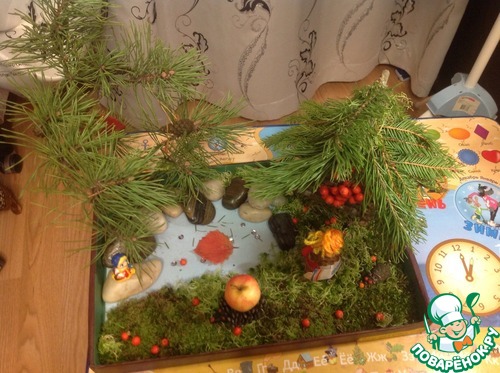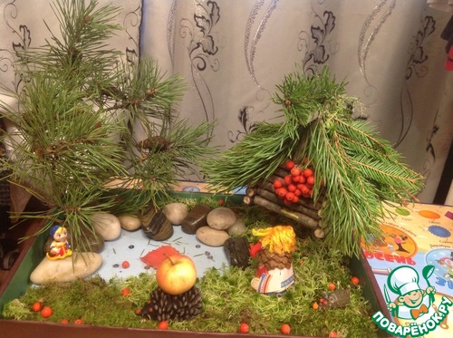 Избушку и веток сделал дедушка. Коробку обклевали цветной бумагой бабушка и сын. Камни вокруг озера и дерева клеил брат. Ну и Машу из Киндер сюрприза приклеил сын.