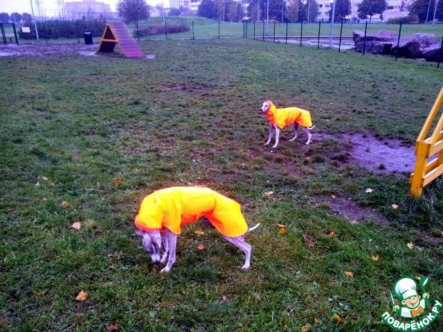 Своим мальчишкам мы сшили новую одежду, плащи. Цвет ядовито оранжевый. Глазам больно на плащи смотреть. Но нам такой цвет и нужен. Его в темноте хорошо видно. А то наш баловник Реечка любит убегать и носится по пляжу в темноте. Фото не качественные. Фотографировала на прогулочной площадке в дождь. Ну ничего мы ещё и с хорошим качеством здесь вам покажемся.