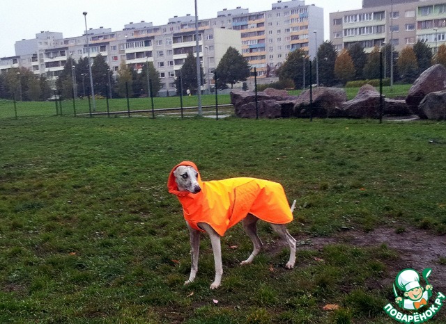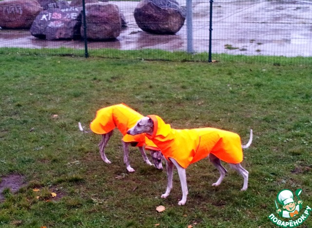 Своим мальчишкам мы сшили новую одежду, плащи. Цвет ядовито оранжевый. Глазам больно на плащи смотреть. Но нам такой цвет и нужен. Его в темноте хорошо видно. А то наш баловник Реечка любит убегать и носится по пляжу в темноте. Фото не качественные. Фотографировала на прогулочной площадке в дождь. Ну ничего мы ещё и с хорошим качеством здесь вам покажемся.