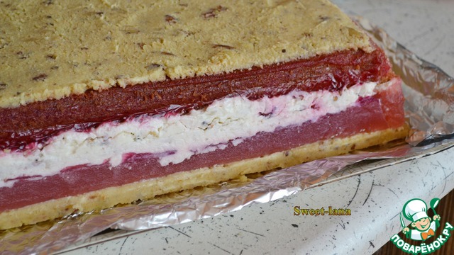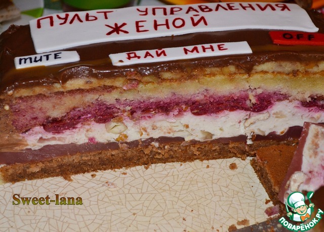 [cut] "Пульт управления женой", 6 кг. Масляный бисквит, творожное суфле с орехами, желе, вишня в коньяке, шоколадная глазурь.