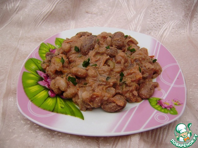 Великолепная фасолька. Очень вкусная. Уже готовлю несколько раз подряд. Правда вид у меня не слишком красивый. Фасоль была красная и вино красное.