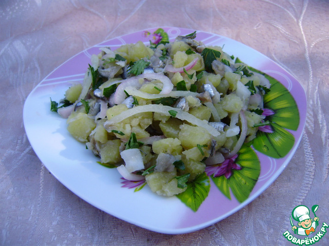 Очень вкусный салатик. У нас в семье очень любят хамсу и маринованный лук.