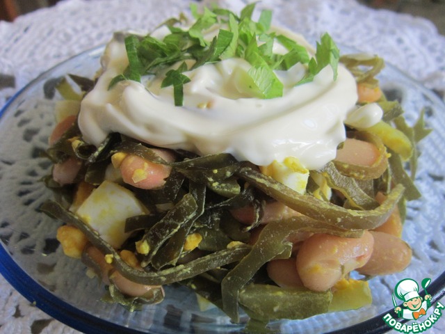 следующий салат "Морские камушки"от Tato-sha, вкусный салат для любителей морской капусты, кстати она не доминирует во вкусе, т.к. смягчена вкусом фасоли, рекомендую