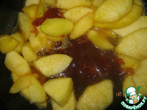 Блинчики готовы, получилось 13 штук (я не специально, так получилось), берусь за соус. Никогда не карамелизировала яблоки. Когда начал растворятся сахар, зачем-то стала его мешать и он взялся комочками Думала все, теперь пока он растворится, то пригорит, но ничего обошлось. Особенное спасибо Татьяне за подсказку, как нужно вводить сливочное масло. Но и тут я испугалась, карамель сразу стала твердой, на свой страх и риск высыпала яблоки и накрыла крышкой при маленьком огне.