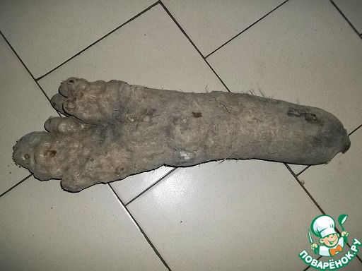 А это у меня «ямс», не знаю, искала перевод в интернете, вот что нашла... У меня на фотке он чуть больше 1 метра и весит примерно 6кг (это средненький). Чем хорош, что отрубил половинку и всю семью накормил!!! И не надо путатьсься с пол-ведра картошки, чтобы накормить гостей. Положил кусочек и все сыты...