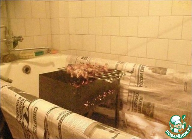 Сам делал, никто не отличил! Маринуешь, ставишь на вторую полку сверху, врубаешь на полную турбо-гриль, 8-10 мин. Обязательно деревянные шпажки. Они подгорают, отсюда и дымок, как от костра!