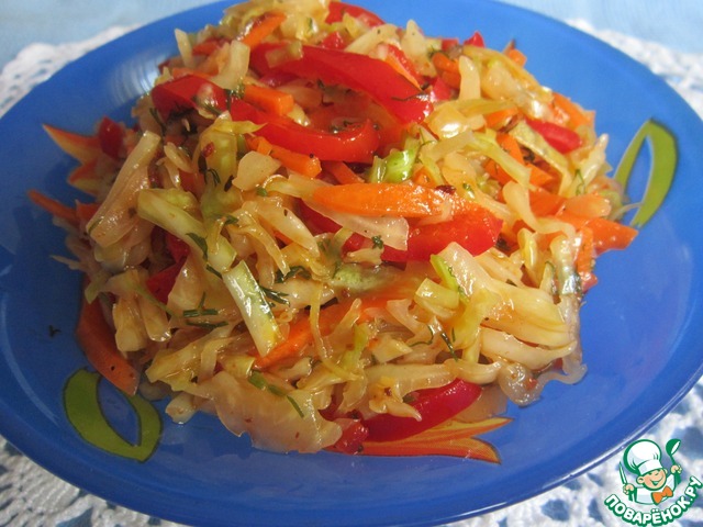 Теперь салатики, Салат закусочный от mtata, такой салат делаю часто, только порезанную капусту солю, потом отжимаю лишний сок, салат не течет и в случае, если капуста горчит, горечь уходит, салат очень вкусный и может стоять в холодильнике до 5 дней