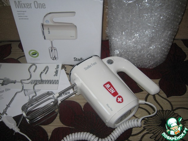 А в посылочке был вот такой замечательный миксер,....у него 5 скоростей,турбо кнопка,насадки для взбивания и насадки для замеса теста.Спасибо сайту и спонсорам за нужный мне приз!