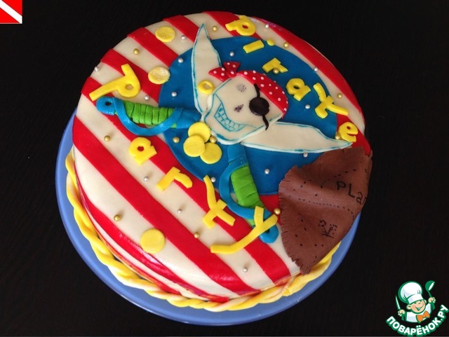 И в завершение, очередной мой тортик с мастикой. Дела по заказу знакомых для пиратской вечеринки, по фото, которое они принесли. Скажу честно, для меня намного проще , оказывается, сделать торт с объемными деталями украшения, чем вот с такими - плоскими. Но, что вышло, то вышло, главное, они остались довольными.