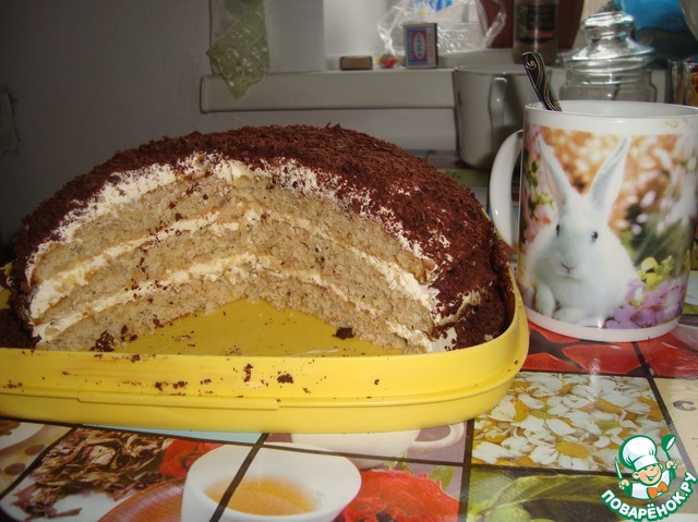 Торт "Маульвурфторте" по рецепту Esenija https://www.povarenok.ru/recipes/show/75703/ Шикарный торт, фотографировала на второй день, бананы немного потемнели, но нам это не помешало его доесть!!!