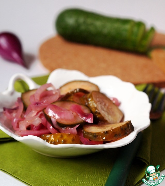 2.Пряные огурцы (салат) https://www.povarenok.ru/recipes/show/78067/ от Танюши-tomi_tn. Этот рецепт уже многие девочки приготовили в закрутках, но сезон, увы, уже прошел , а мне очень хотелось его опробовать. Огурцов у меня было немного, всего на 1л баночку, поэтому я и не стала закрывать её на зиму, а пустила сразу в ход(т.е. в рот)! Лук взяла красный, белого-не было, желтый-в руку не попался, когда искала его в ящике. Всё остальное-точно по рецепту, даже сахар коричневый не пожалела! Вкус получился-отменный!! Уж на что я не особый любитель острых салатов, но этот оказался очень гармоничным по кислоте и сладости....Настаивался 1 ночь, а на другой день мы уже его доели. Вкусно-о-о!!