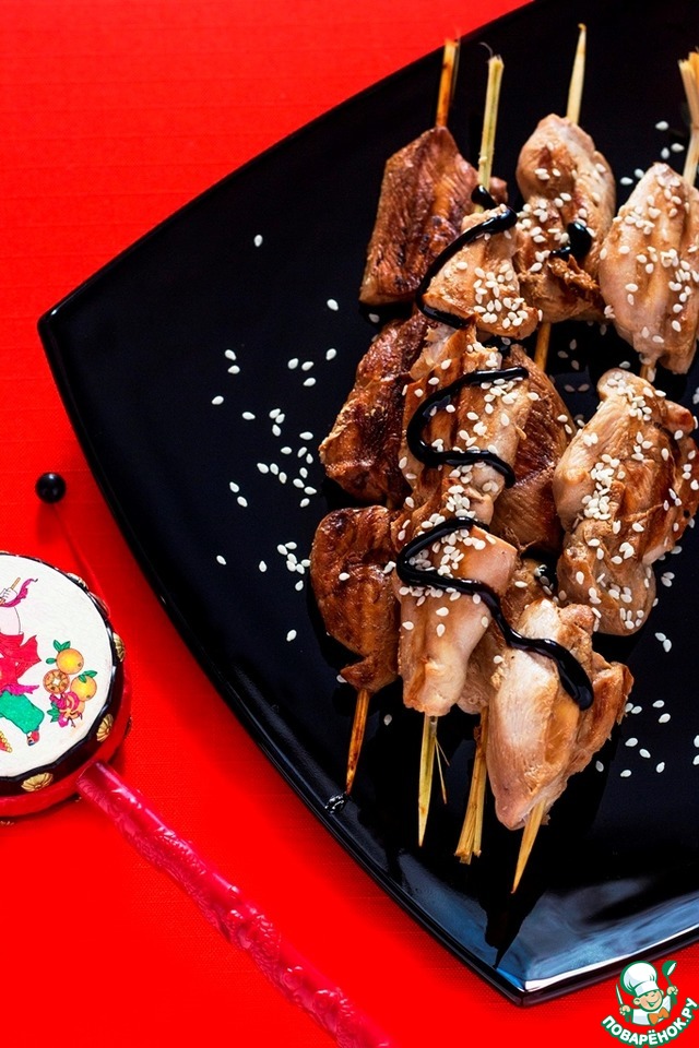 1. Якитори https://www.povarenok.ru/recipes/show/36004/ Шашлычки песподобные, я жарила на сковородке-гриль, курочка очень мягкая получилась, очень вкусно