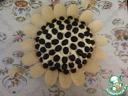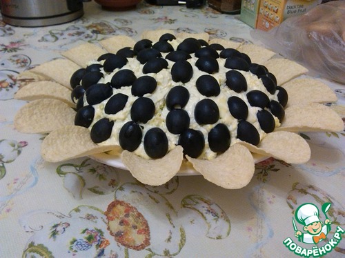 Украшаем оливками и чипсами, можно пустить кайму, понизу у чипсов, из мелко нарезанного укропа.