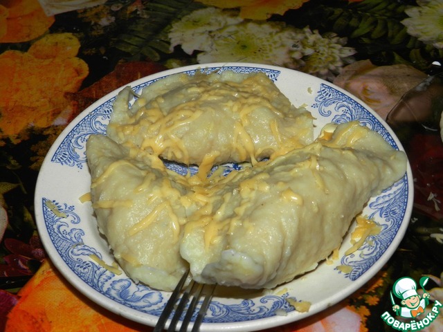 Мой милый месил это тесто очень долго, я добавляла муку, чтобы можно было хорошо лепить. Получилось много теста и мало начинки. Но тесто оставлять не хотелось, поэтому я делала очень большие колдуны