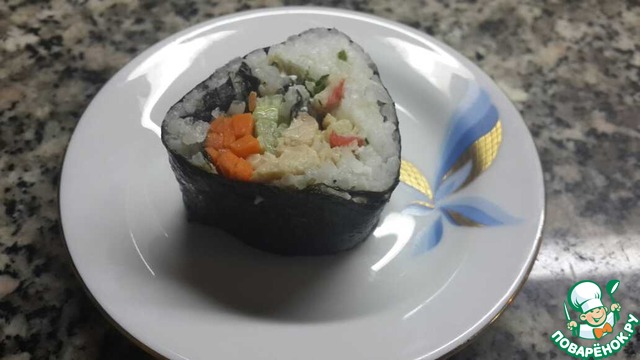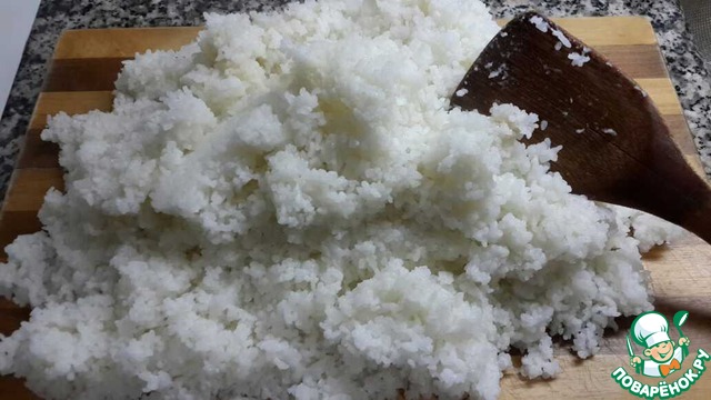 Делал он это в первый раз,поэтому немного перестарался,рис немного покрошился.