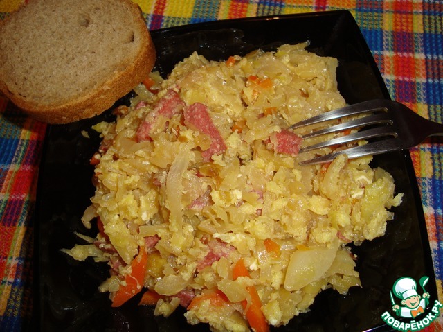Капуста по-орловски https://www.povarenok.ru/recipes/show/91179/ от Tato-sha. Добавила к капусте салями, для вкуса. Улетела капуста в пять секунд. Очень понравилась.