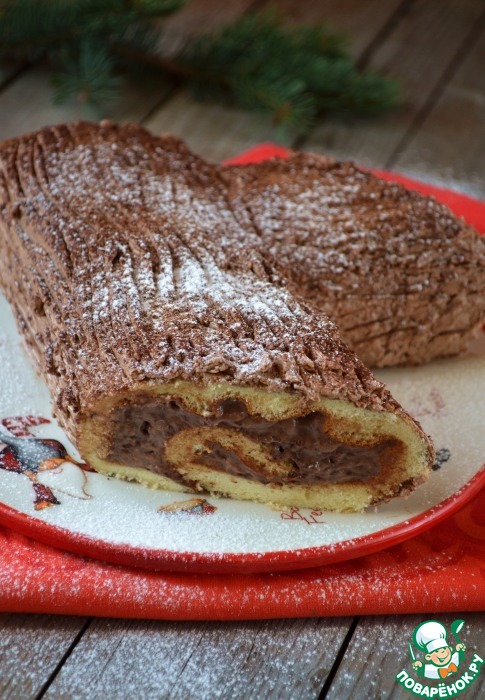 Сборка: остывший корж аккуратно развернуть и смазать всю поверхность кремом №1, поверх крема натереть темный шоколад и чуть-чуть прижать. Свернуть рулет. Поставить на 1 час в холодильник. Затем аккуратно обрезать края - с одной стороны ровно, с другой под углом - отрезая будущий "сучок". Приложить "сучок" к "полену" и "приклеить" на масляный крем. Покрыть всю поверхность "полена" кремом №2. Вилкой прорисовать характерный рисунок древесной коры. Посыпать какао и сахарной пудрой. Украсить по желанию.
