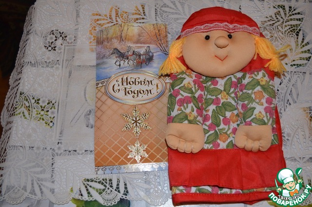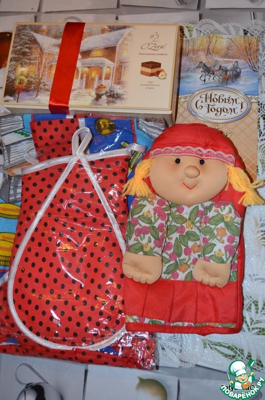 А еще Катенька с семьей нам отправили новогодний фартучек с овечкой и еще двумя прихватками!Очень нарядный и полезный!Так как готовим в семье теперь все,даже Ваня,а фартук всего один,то новенький с барашком точно будет пользоваться спросом у моих родных))