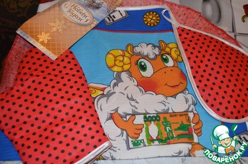 А еще Катенька с семьей нам отправили новогодний фартучек с овечкой и еще двумя прихватками!Очень нарядный и полезный!Так как готовим в семье теперь все,даже Ваня,а фартук всего один,то новенький с барашком точно будет пользоваться спросом у моих родных))