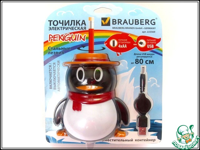 Это подарок лично для Ярослава))) Он от него в полном восторге))) Вчера весьма расстроился, когда я не разрешила распаковать ему пингвина! Но вошел в мое положение))) Замечательная точилка, которая поселилась на рабочем столе у Яра))) А вот шнур забрал себе Сережик со словами:"В точилку можно вставить батарейки, а шнурок весьма