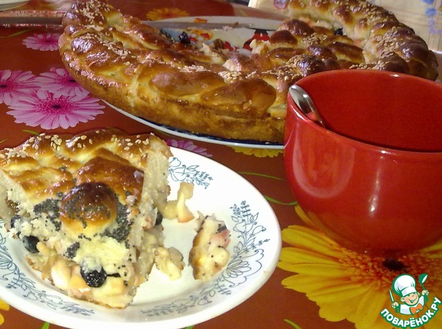 Дрожжевое тесто можно приготовить по любимому своему рецепту из расчета на 500 г муки. Когда оно подойдет, часть раскатать и выложить в форму, сформировать бортики. Начинку перемешать и выложить на тесто. Далее оформить по желанию. Я попыталась сделать мак, ромашку и пчелку.