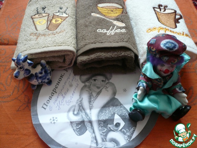 Вот и 3 полотенчика кофейных оттенков, фарфоровая овечечка и милейший клоунчик, которого я очень полюбила