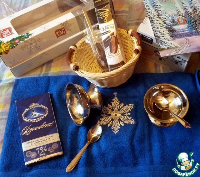 Креманки из нержавеющей стали с ложечками и 100 г.й горький шоколад с миндалём.