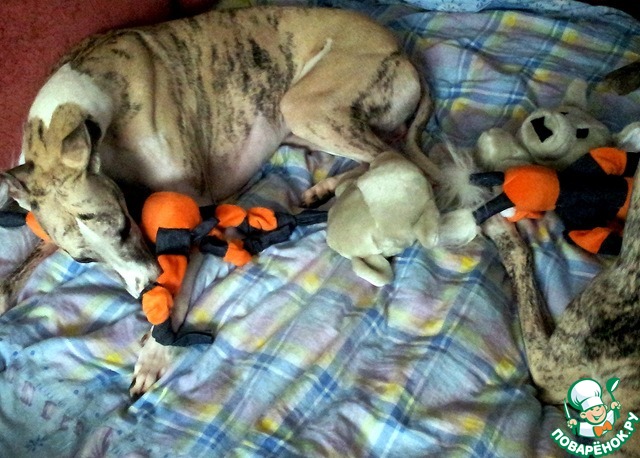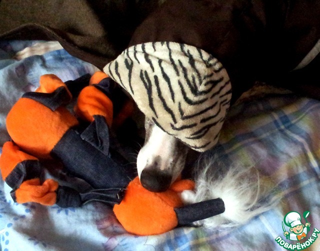 А тут он уже после прогулки поел и отдыхает с игрушками. Не захотел расставаться с ними, как и Джек. Он с игрушками уснул в кресле. Лохматые ушки пришлось укоротить, а то инопланетяне без них останутся, как и без глаза... Глазки я убрала, приклею когда наиграются игрушками. Тогда уже не будут ничего отгрызать.