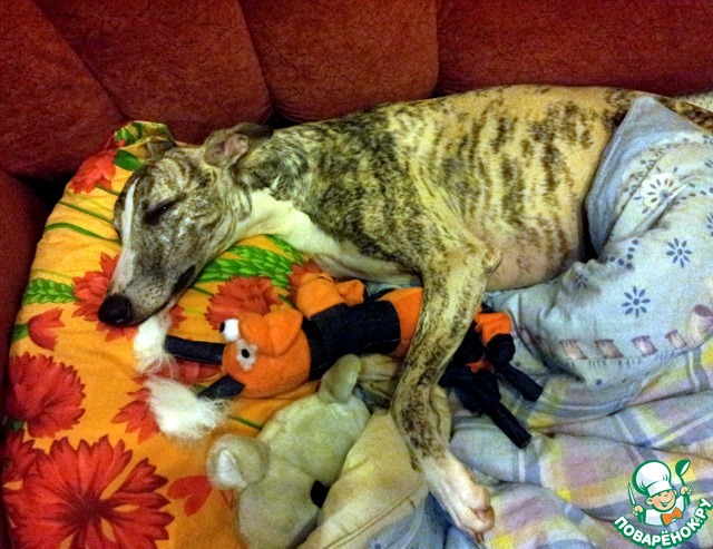 А тут он уже после прогулки поел и отдыхает с игрушками. Не захотел расставаться с ними, как и Джек. Он с игрушками уснул в кресле. Лохматые ушки пришлось укоротить, а то инопланетяне без них останутся, как и без глаза... Глазки я убрала, приклею когда наиграются игрушками. Тогда уже не будут ничего отгрызать.
