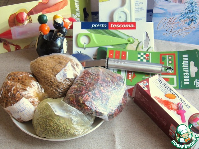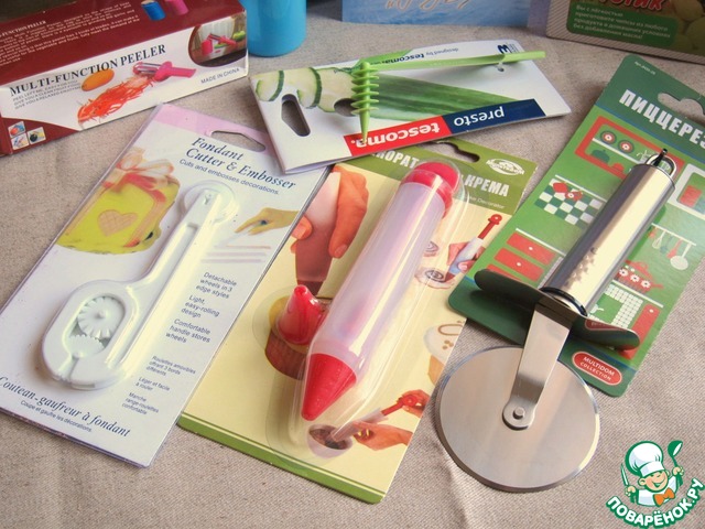 Дальше доставая подарки я удивилась сколько всего поместилось в небольшую с виду коробку! Нож для пиццы (у меня его нет поэтому вещь нужная!), декоратор для крема - уже руки чешутся приготовить рождественские пряники и разрисовать их! Следом идет приспособление (как я поняла) для мастики. Зеленая штучка от Тескомы для фигурной нарезки огурчиков - с радостью буду ее применять для салатов.