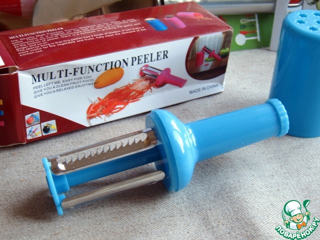 А этот голубой гаджет сочетает в себе овощечистку и лезвие для нарезки овощей соломкой