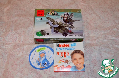 Это Ванюшкин подарочек: конструктор "Лего" и шоколадка "Киндер". Малый в восторге, это его любимое дело: лопать шоколад и собирать конструкторы