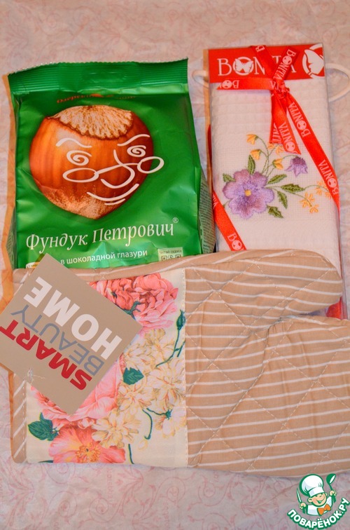 Самая большая моя слабость - это орешки! Леночка и тут угадала, орешки в шоколаде, что еще для счастья нужно?!!! А еще плюс вот такая милая прихваточка и чудесное полотенчико с мылом!