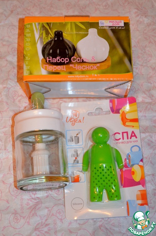 Вы думаете это все? А вот и нет! Еще вот такое ситечко прикольное для чая, стильный набор для специй и силиконовая кисточка в контейнере! Круто, Да?!!!