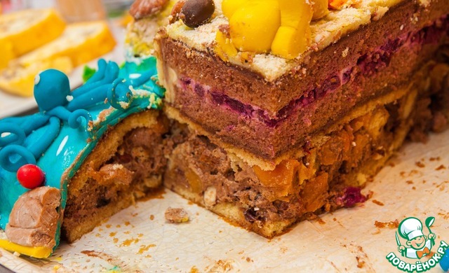 Море (нижний торт) - белый бисквит на сгущенке; крем: взбитые сливки+сгущенка+шоколад; начинка: фундук, курага, чернослив. Остров (верхний торт) - коричневый бисквит на сгущенке; крем творожный, начинка - вишня.