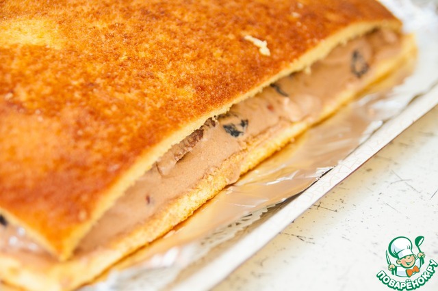Море (нижний торт) - белый бисквит на сгущенке; крем: взбитые сливки+сгущенка+шоколад; начинка: фундук, курага, чернослив. Остров (верхний торт) - коричневый бисквит на сгущенке; крем творожный, начинка - вишня.