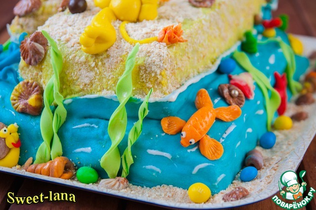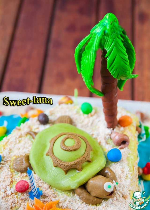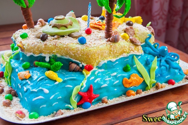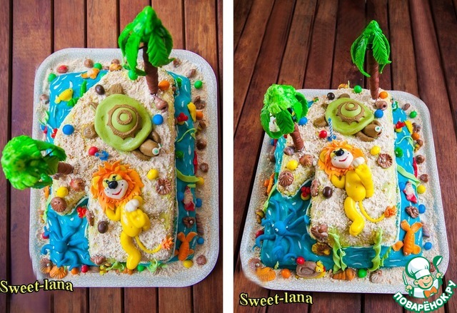 Изначально мне хотелось сделать торт в виде единицы, но было приглашено около 20-ти человек, подумала, что единица - это маленький торт. И мне пришла в голову идея сделать остров в виде единицы и море вокруг.