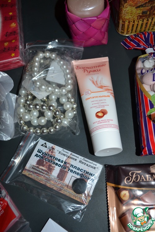 Теперь подробнее, это подарочки мне: кремик для ручек, бусики с браслетиком, и штукенция на телефон которая бережет меня от вредных радио волн.