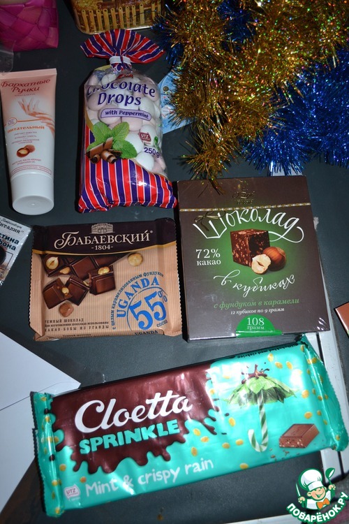 Светочка спасибо тебе за подаренный праздник пришедший в наш дом! Нам все очень понравилось, Виктор оценил сладости, особенно нам понравилась мятная шоколадка. Я такую никогда не пробовала, и не видела, просто чудесная.