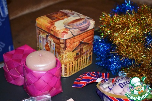 Чудесная свечка в плетеной корзинке, и очень нужная металлическая баночка, в ней конфетки.