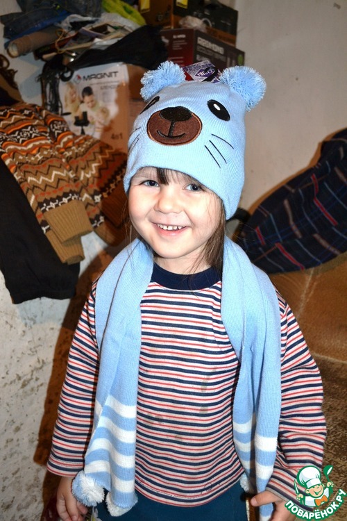 Евдокия первым делом достала шапочку и шарфик и одела на себя, но прочитав письмо я ей сообщила что это Назару и она смиренно отдала ему его подарок, тем более что увидела что для неё есть красивые бантики, она их сразу спрятала и сказала что на елку вместе с платьем оденет. Сынуля сегодня в садик пошел в новой шапочке и шарфике. Правда фотографироваться он не любит.