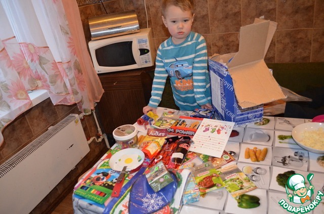 Настя здорово помогла,сдерживала Ваню,пока я пыталась раскладывать подарки и фотографировать. На каждую вещь из посылки Ванечка кричал:"Мое,мне!!!"