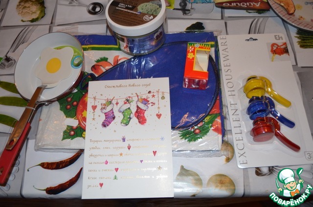 Чудесная добрая открытка, замечательный кухонный набор с прихватками и полотенчиком,даже порционная сковородка с лопаточкой, и пробки(!!!!Ура) на бутылки!!!