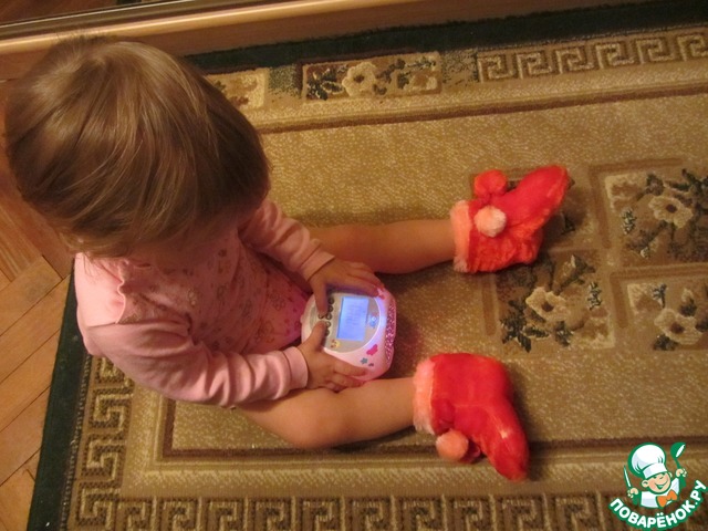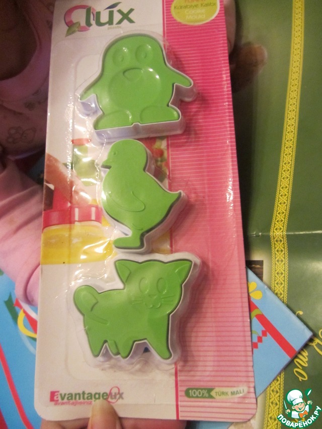 А это уже нам с Кариной вместе - чудесные формочки-печатки для печенья! Т.е. печенье вырезается, а потом выдавливается прямо на противень. Буду печь Карине печенюшки (она обожает печенье) в виде котика, пингвинчика и цыпленка! Карина не отпускала формочки даже для фотографии, вот держит их ручками)