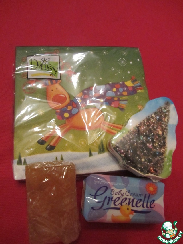 А это для души - новогодние салфеточки (рисунки на них разные), ёлочка - это полотенце, надо его только размочить (пока это я еще не сделала) и два мыла. Первое - это мыло, сваренное монахинями Свято-Елисаветинского монастыря г. Минска. В этом монастыре Ириша венчалась со своим мужем! Оно такое ароматное!!! Просто волшебное! Мне очень приятно было получить это мыло в подарок, правда! Второе мыльце - детское, для Карины. Оно тоже обалденное! Очень ароматное! Тоже уже положила Карине, мыли ручки уже!