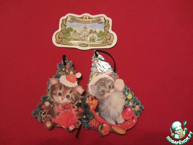 А это тоже из этого же монастыря - чудесный магнитик (уже украшает холодильник) и две такие вот замечательные игрушечки с котиками! Скоро поставим ёлку и повесим обязательно такую красоту!