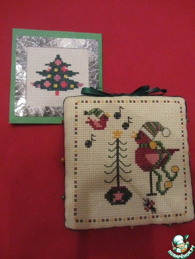 А это снова творения Иришки - две чудесные вышивки - новогодняя подушечка с птичками и ёлочкой, я просто в восторге от неё! Уже знаю, где она будет стоять! Вторая вышивка - на открыточке ручной работы! Как же приятно получать такие вещи!!!