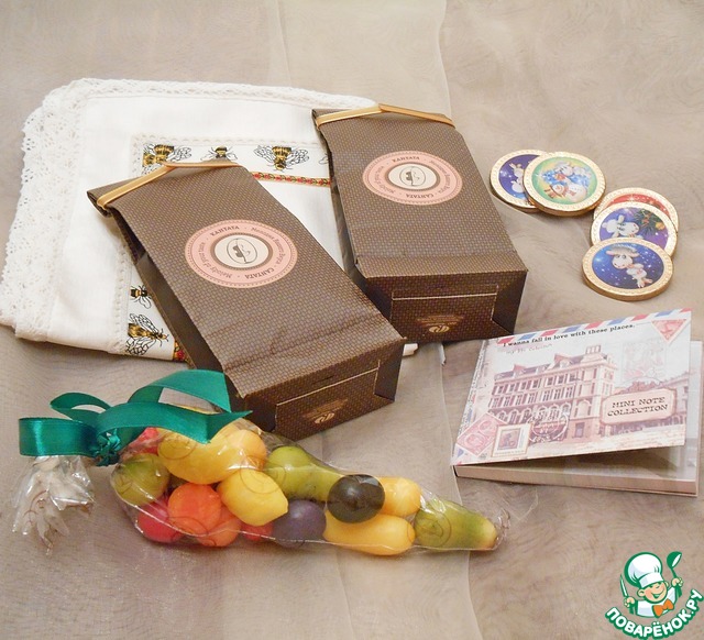 Мой любимый зеленый чай, шоколадки и конфетки. Блокнотик пришлось оторвать от сердца и отдать сыну, очень просил, у него как раз сейчас такой возраст - записочки в школе, дневнички...