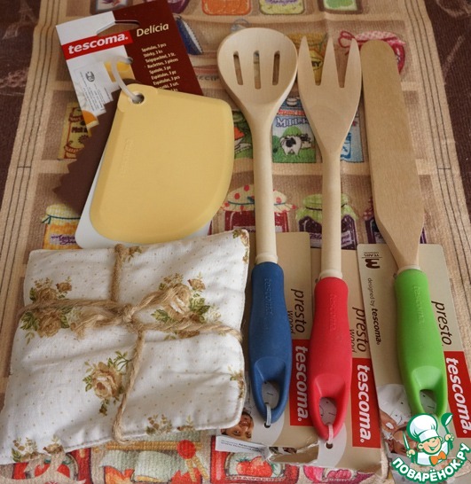 Так же Оля прислал красивое, мягонькое полотенце, которое на фото служит фоном, целую россыпь кухонных приспособлений, как будто прочитав мои мысли, как раз я собиралась сменить все лопаточки на деревянные, потому что силиконовые, с пластиковыми ручками, у меня поломались буквально одна за одной, (даже толстенная большая лопаточка, я была в шоке), классные шпатели для тортиков и ароматическая подушечка.
